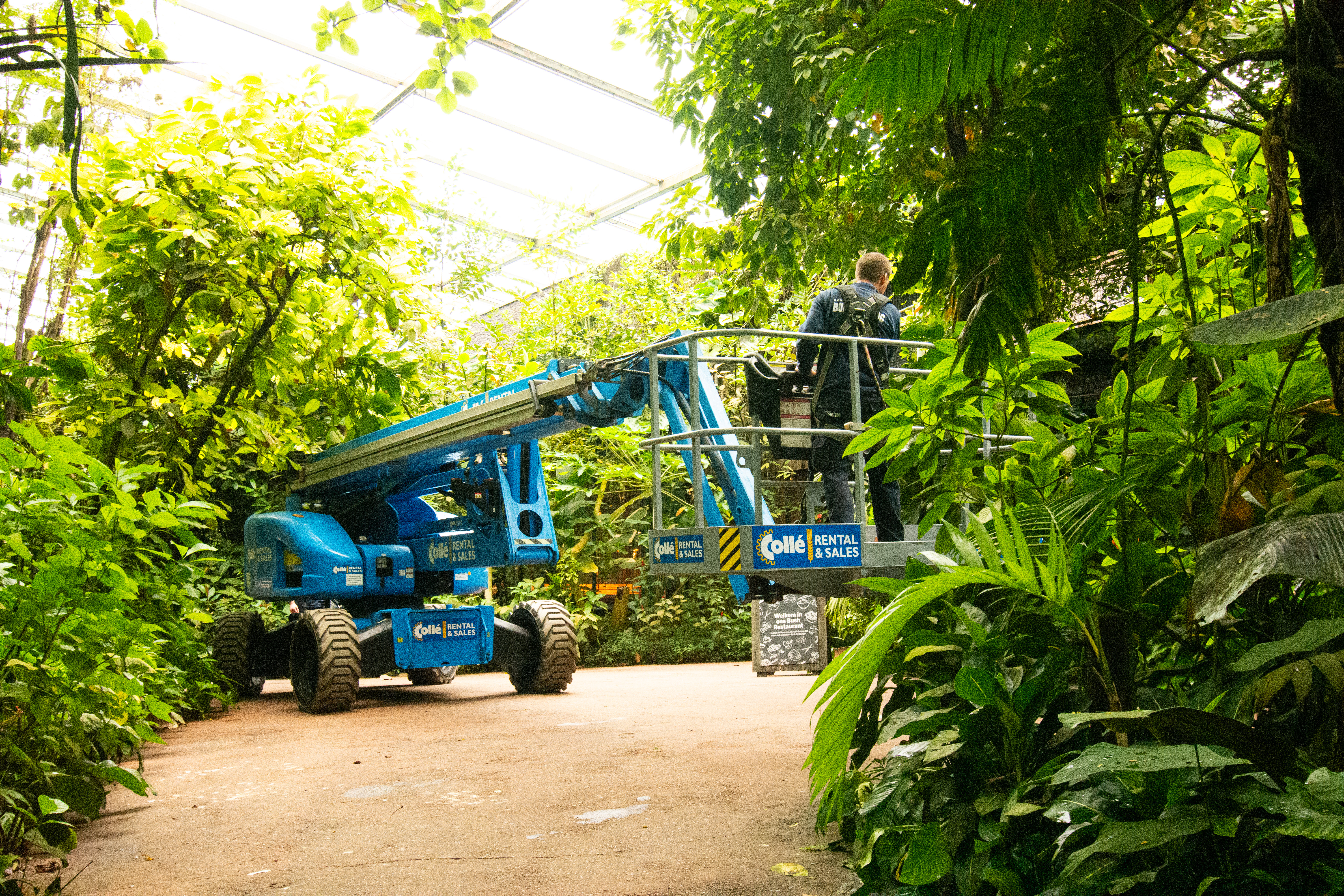 “Hier in de Bush is het vooral het snoeiwerk en het bijhouden van het dak op hoogte, en daar hebben wij zelf de middelen niet voor. Hier schakelen we Collé in.”, Gerard Odijk, teamleider van de mechanische afdeling bij Burgers’ Zoo.